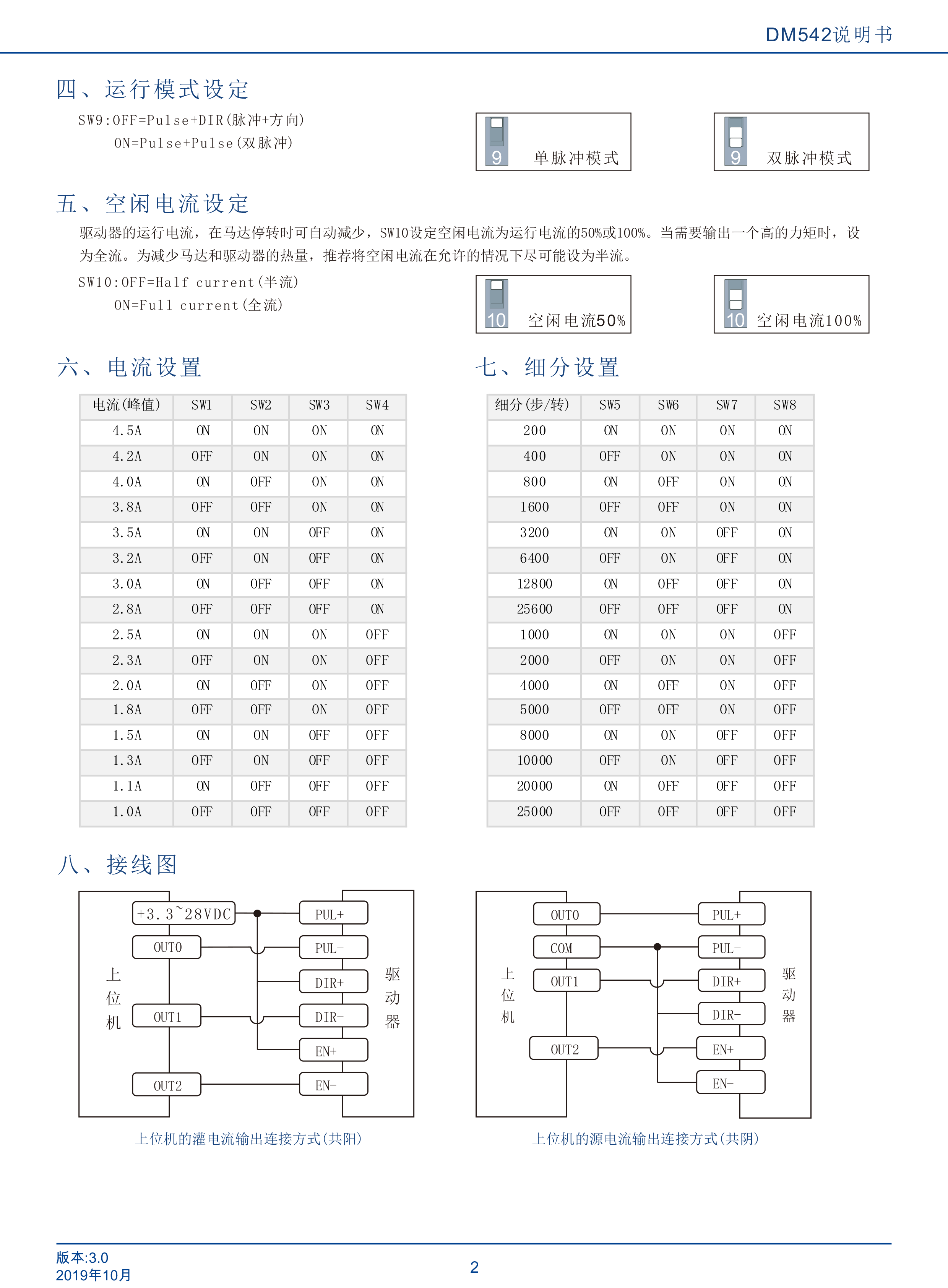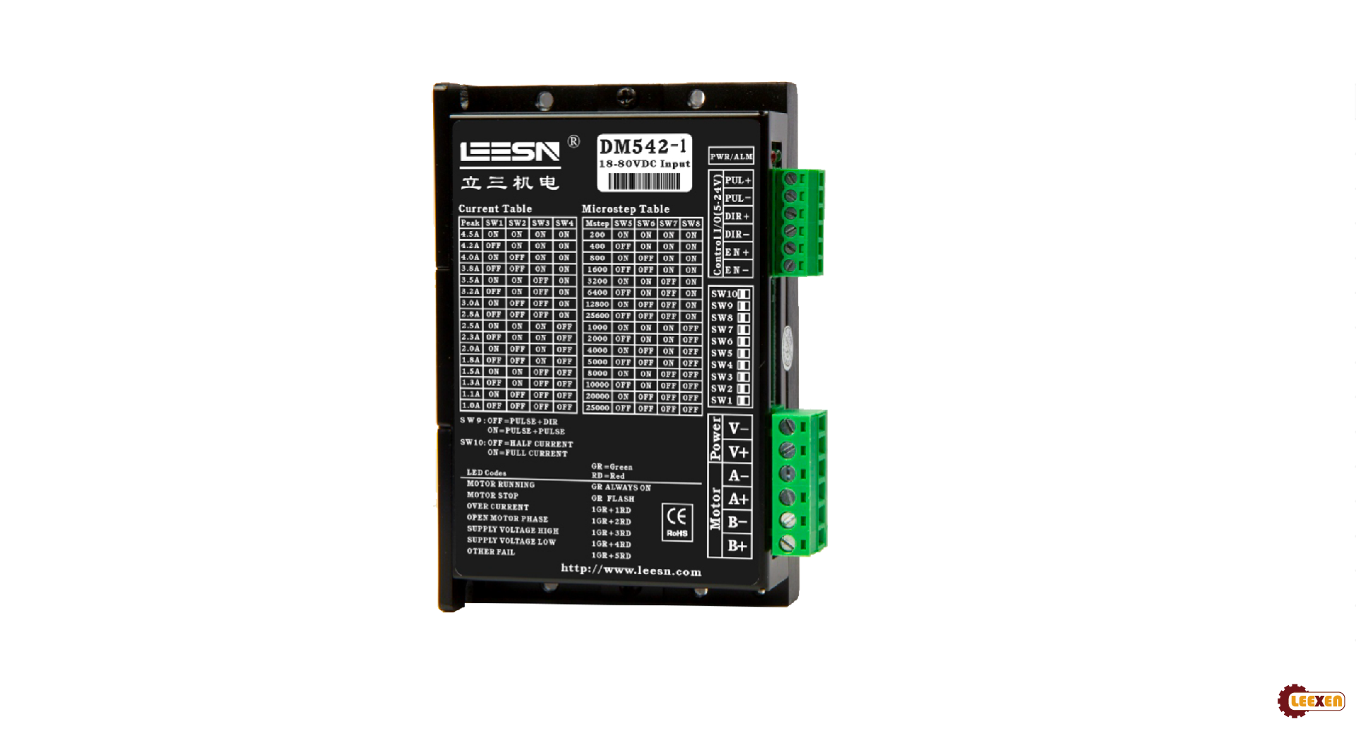 DM542是立成公司最新研制的基于新一代基于32位DSP技術(shù)的高性能兩相數(shù)字式步進(jìn)驅(qū)動器,驅(qū)動電壓DC24V-80V,適配電流 4.5A以下,外徑42~86mm的各種型號兩相混合式步進(jìn)電機(jī)。該驅(qū)動器采樣類似伺服的控制原理,獨(dú)特的電路設(shè)計(jì),優(yōu)越的軟件算法處理,使電機(jī)即使在低細(xì)分下也能運(yùn)行平穩(wěn),幾乎沒有振動和噪音,平滑、精確地電流控制技術(shù)大大減少了電機(jī)發(fā)熱,外置16檔等角度恒力矩細(xì)分,最高25600細(xì)分,光耦隔離差分信號輸入,抗于擾能力強(qiáng),具有過壓、欠壓、過流保護(hù)等出錯保護(hù)功能。在點(diǎn)膠機(jī)、激光雕刻等中、低速應(yīng)用領(lǐng)域,其平穩(wěn)性、振動、噪聲性能優(yōu)勢明顯,可大大提高設(shè)備性能。