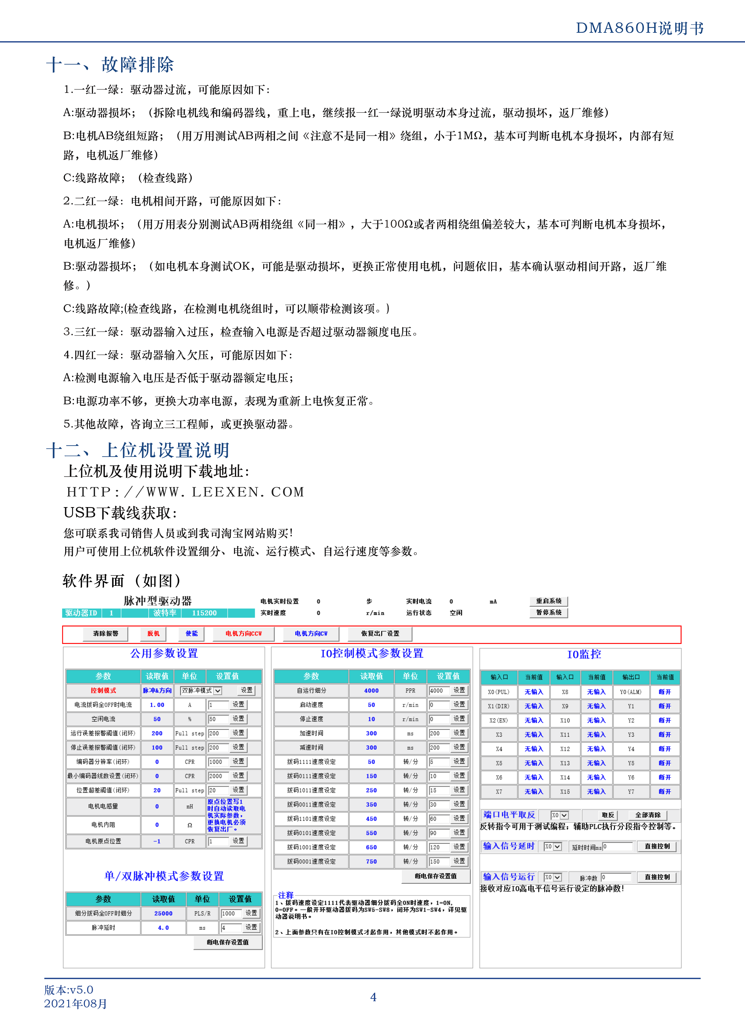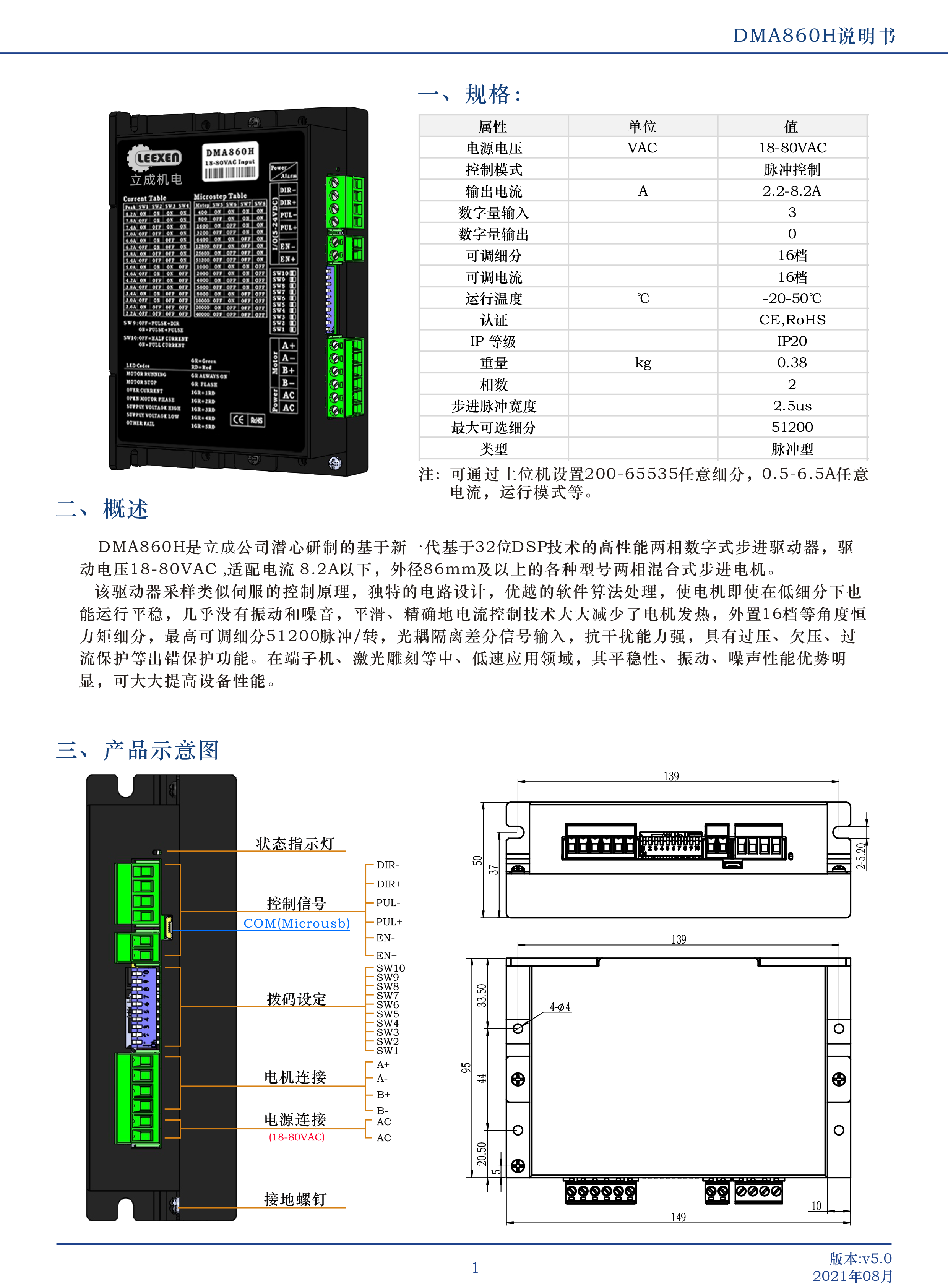 DMA860H是立成公司潛心研制的基于新一代基于32位DSP技術(shù)的高性能兩相數(shù)字式步進(jìn)驅(qū)動(dòng)器,驅(qū)動(dòng)電壓18-80VAC適配電流 8.2A以下,外徑86mm及以上的各種型號(hào)兩相混合式步進(jìn)電機(jī)。該驅(qū)動(dòng)器采樣類似伺服的控制原理,獨(dú)特的電路設(shè)計(jì),優(yōu)越的軟件算法處理,使電機(jī)即使在低細(xì)分下也能運(yùn)行平穩(wěn),幾乎沒有振動(dòng)和噪音,平滑、精確地電流控制技術(shù)大大減少了電機(jī)發(fā)熱,外置16檔等角度恒力矩細(xì)分,最高可調(diào)細(xì)分51200脈沖/轉(zhuǎn),光耦隔離差分信號(hào)輸入,抗干擾能力強(qiáng),具有過壓、欠壓、過流保護(hù)等出錯(cuò)保護(hù)功能。在端子機(jī)、激光雕刻等中、低速應(yīng)用領(lǐng)域,其平穩(wěn)性、振動(dòng)、噪聲性能優(yōu)勢明顯,可大大提高設(shè)備性能。
