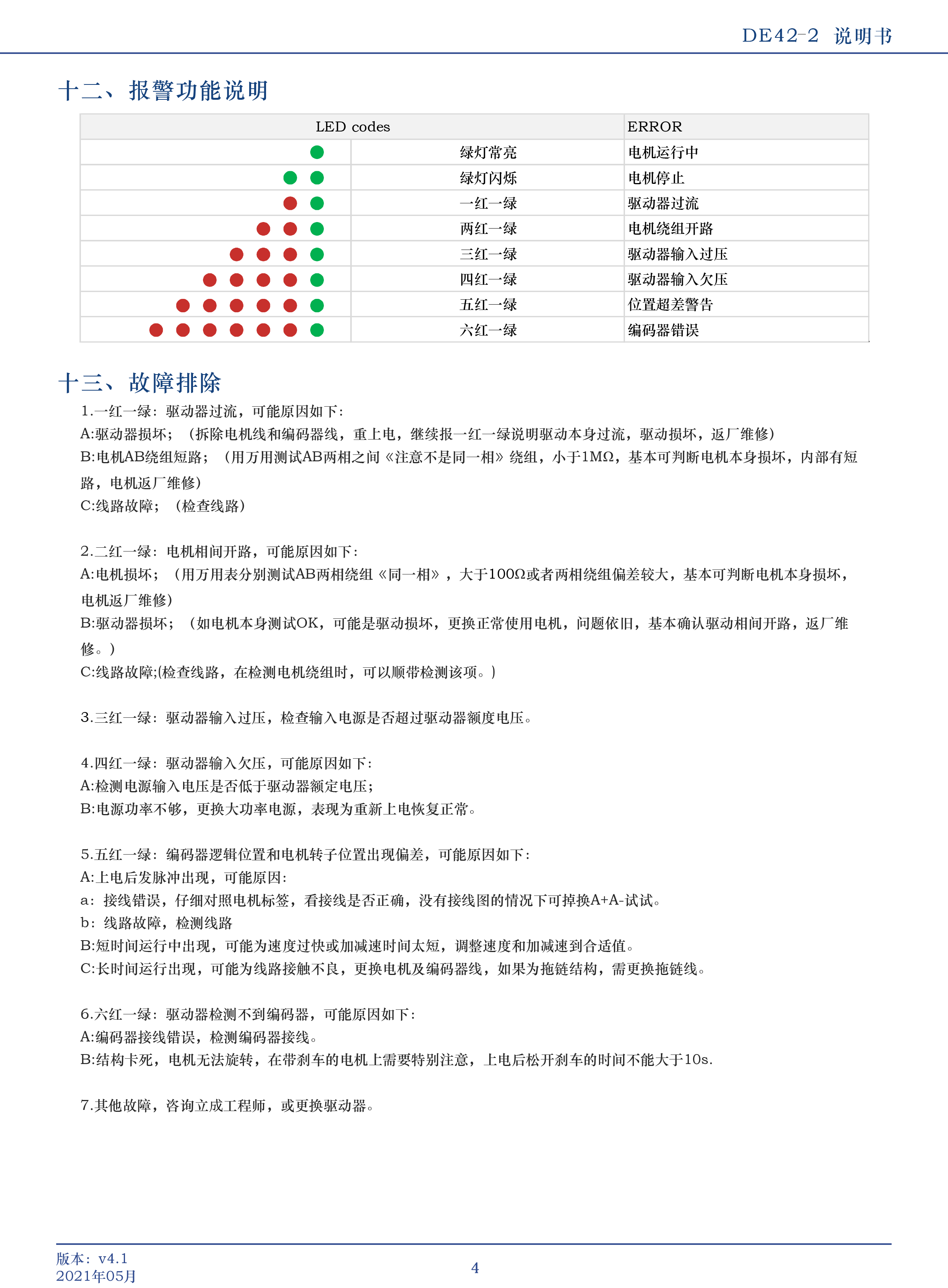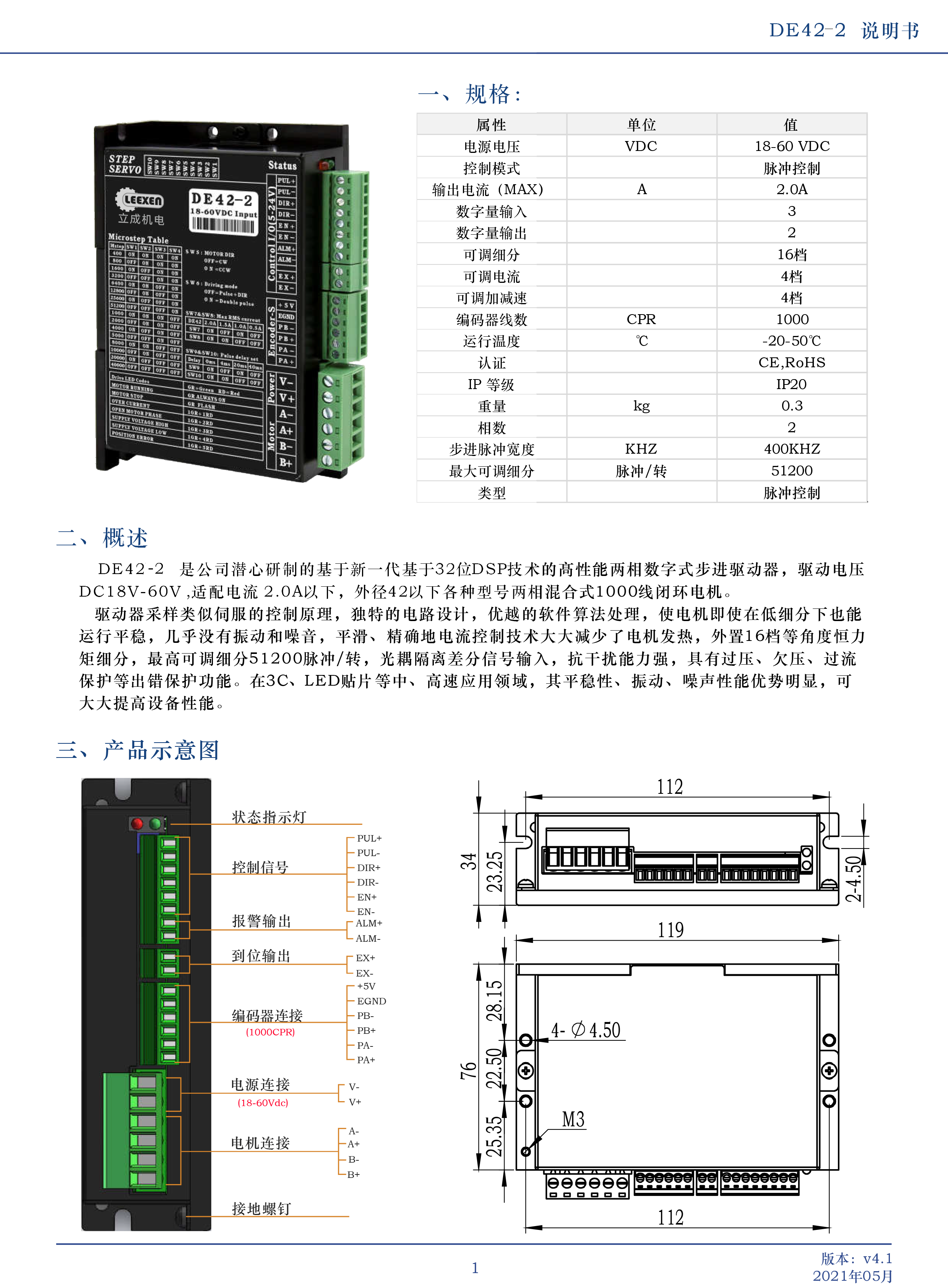 DE42-2 是公司潛心研制的基于新一代基于32位DSP技術的高性能兩相數字式步進驅動器,驅動電壓DC18V-60V適配電流 2.0A以下,外徑42以下各種型號兩相混合式1000線閉環(huán)電機。驅動器采樣類似伺服的控制原理,獨特的電路設計,優(yōu)越的軟件算法處理,使電機即使在低細分下也能運行平穩(wěn),幾乎沒有振動和噪音,平滑、精確地電流控制技術大大減少了電機發(fā)熱,外置16檔等角度恒力矩細分,最高可調細分51200脈沖/轉,光耦隔離差分信號輸入,抗干擾能力強,具有過壓、欠壓、過流保護等出錯保護功能。在3C、LED貼片等中、高速應用領域,其平穩(wěn)性、振動、噪聲性能優(yōu)勢明顯,可大大提高設備性能。