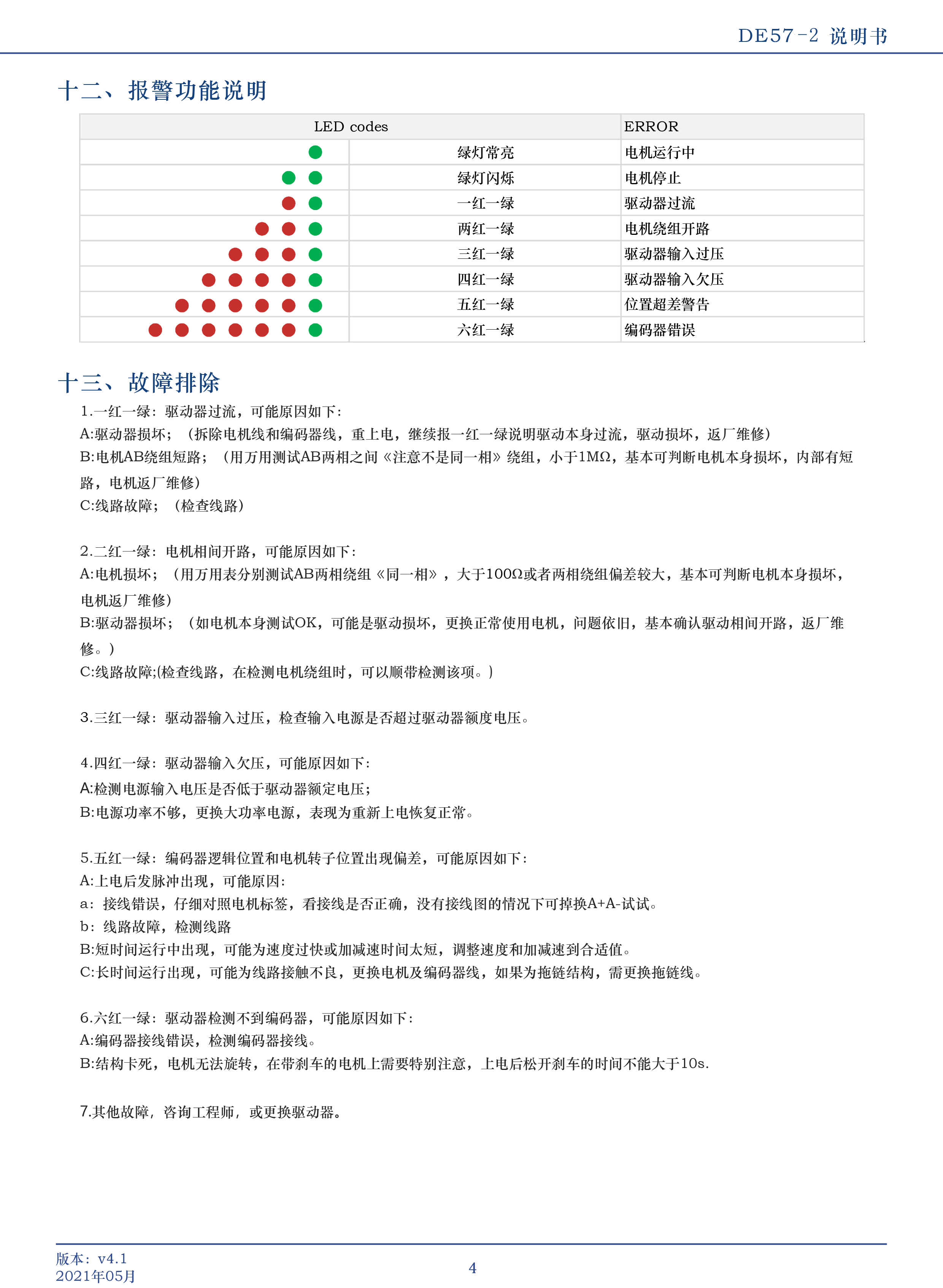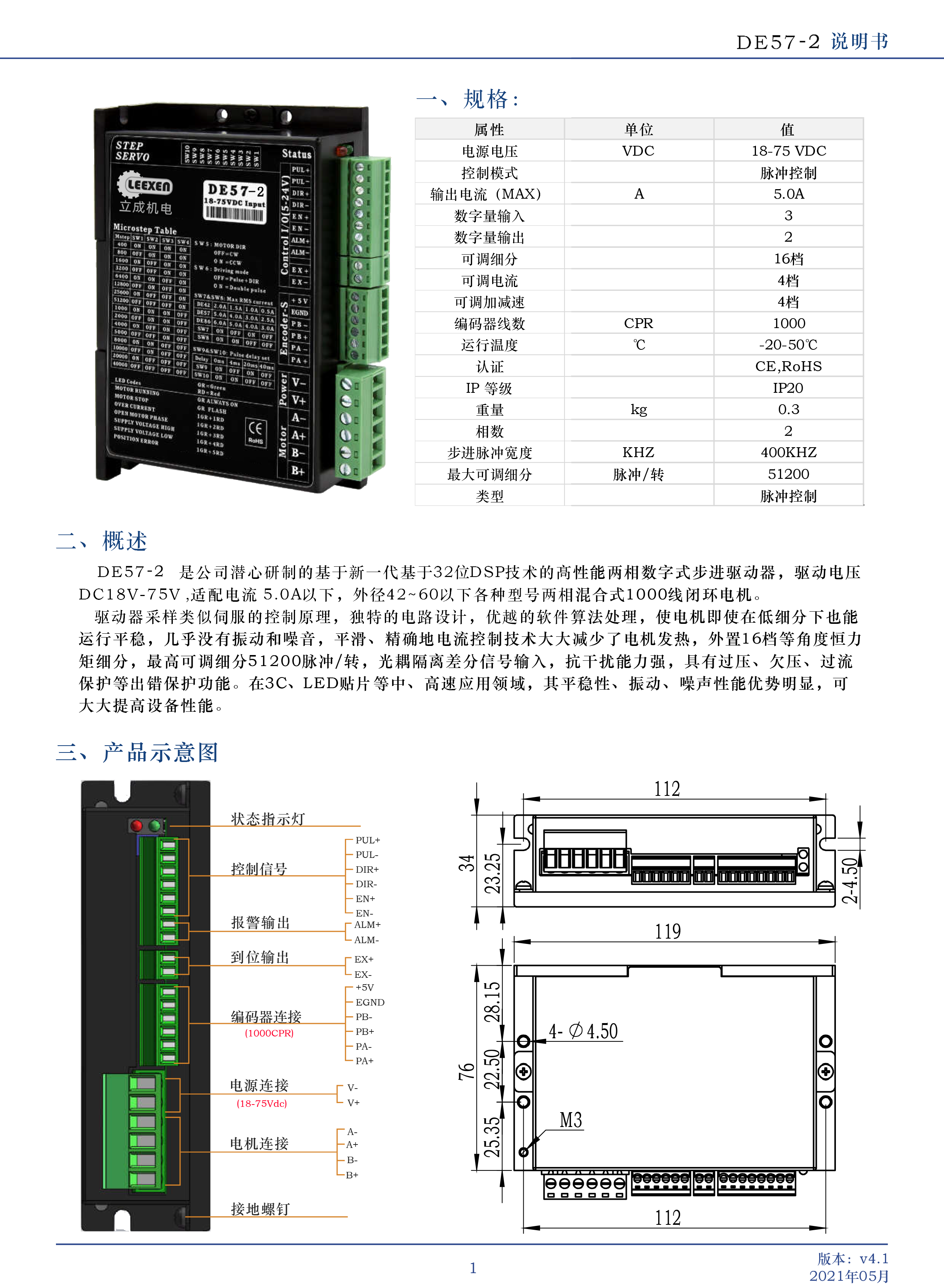 DE57-2 是公司潛心研制的基于新一代基于32位DSP技術的高性能兩相數(shù)字式步進驅(qū)動器,驅(qū)動電壓DC18V-75V,適配電流 5.0A以下,外徑42~60以下各種型號兩相混合式1000線閉環(huán)電機。驅(qū)動器采樣類似伺服的控制原理,獨特的電路設計,優(yōu)越的軟件算法處理,使電機即使在低細分下也能運行平穩(wěn),幾乎沒有振動和噪音,平滑、精確地電流控制技術大大減少了電機發(fā)熱,外置16檔等角度恒力矩細分,最高可調(diào)細分51200脈沖/轉(zhuǎn),光耦隔離差分信號輸入,抗干擾能力強,具有過壓、欠壓、過流保護等出錯保護功能。在3C、LED貼片等中、高速應用領域,其平穩(wěn)性、振動、噪聲性能優(yōu)勢明顯,可大大提高設備性能。