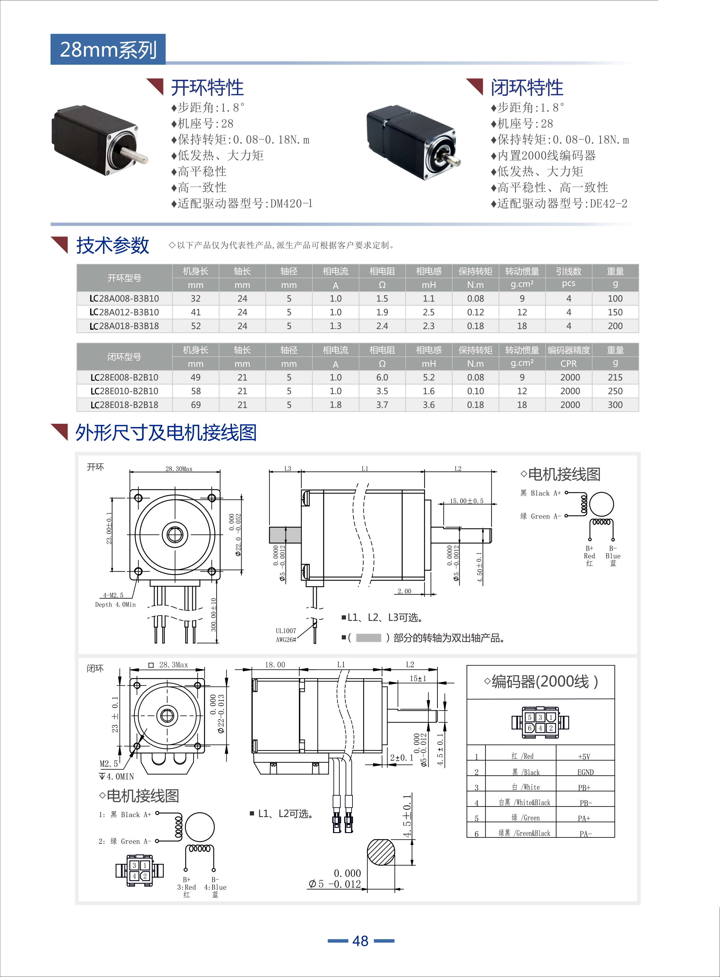 開環(huán)特性 步距角:1.8 機(jī)座號:28 保持轉(zhuǎn)矩:0.08-0.18N.m 低發(fā)熱、大力矩 高平穩(wěn)性 高一致性 適配驅(qū)動器型號:DM420-1 | 閉環(huán)特性 步距角:1.8 機(jī)座號:28 保持轉(zhuǎn)矩:0.08-0.18N.m 內(nèi)置2000線編碼器 低發(fā)熱、大力矩 高平穩(wěn)性、高一致性 適配驅(qū)動器型號:DE42-2 |