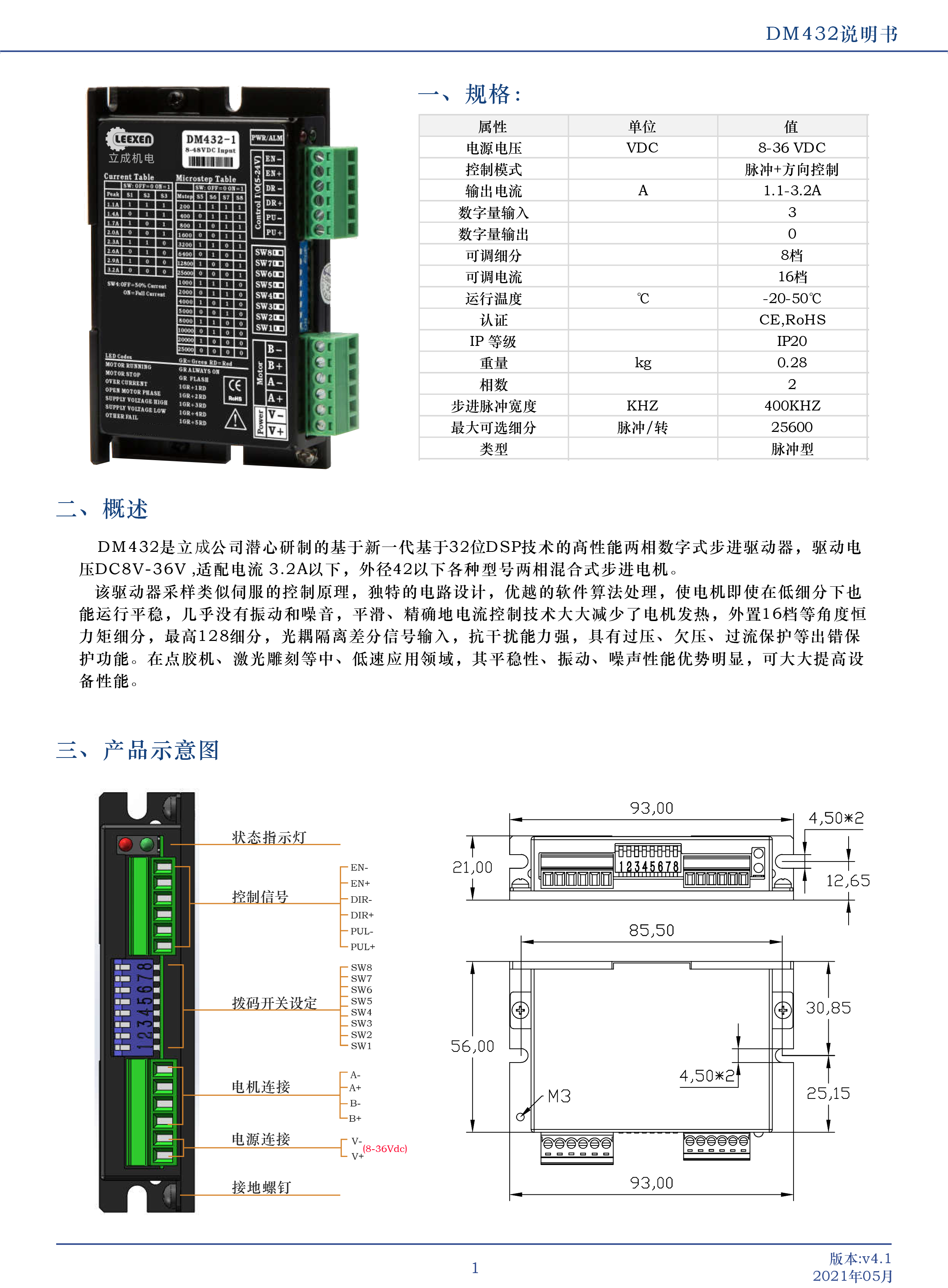 DM432是立成公司潛心研制的基于新一代基于32位DSP技術(shù)的高性能兩相數(shù)字式步進驅(qū)動器,驅(qū)動電壓DC8V-36V適配電流 32A以下,外徑42以下各種號兩相混合式步進電機該驅(qū)動器采樣類似伺服的控制原理,獨特的電路設(shè)計,優(yōu)越的軟件算法處理,使電機即使在低細分下也能運行平穩(wěn),幾乎沒有振動和噪音,平滑、精確地電流控制技術(shù)大大減少了電機發(fā)熱,外置16檔等角度恒力矩細分,最高128細分,光耦隔離差分信號輸入,抗干擾能力強,具有過壓、欠壓、過流保護等出錯保護功能。在點膠機、激光雕刻等中、低速應(yīng)用領(lǐng)域,其平穩(wěn)性、振動、噪聲性能優(yōu)勢明顯,可大大提高設(shè)備性能。